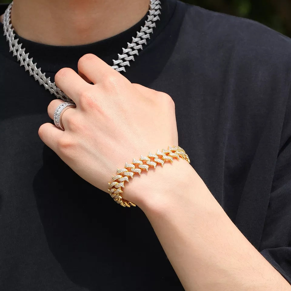 CZ Rivet Cuban Link Chain Necklace Bracelet Set Hip Hop Jewelry